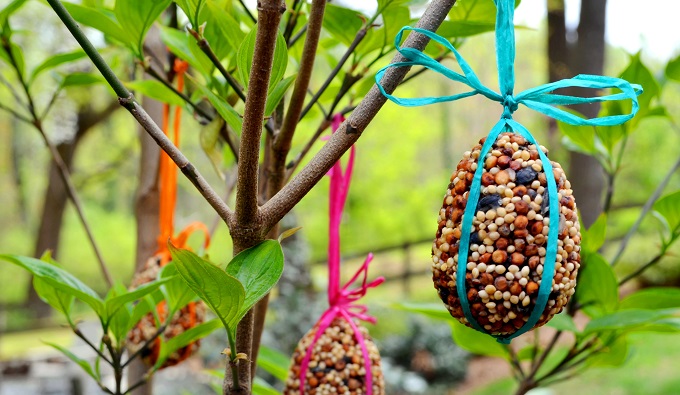 - Craft: Make birdseed Easter eggs by mixing birdseed with coconut oil or natural peanut butter and molding it into Easter egg shapes. Add a yarn (or other material) loop to hang them on a tree.