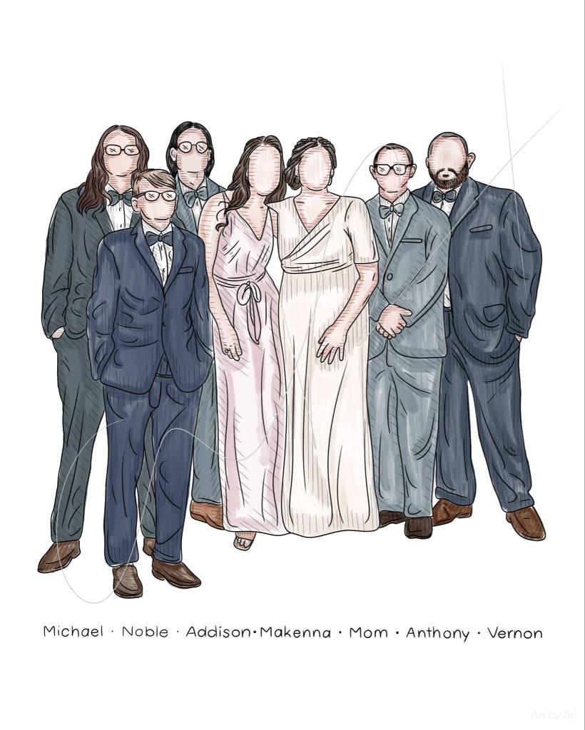 “I love incorporating God into my art—through scripture, heavenly additions, or just quietly praying over the families as I draw them.” – Arianne Peters